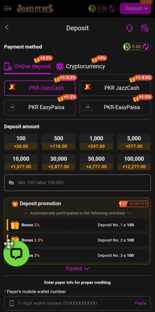 Many users look for EasyPaisa and JazzCash options inside the wallet section. Always confirm the method list within the app before depositing.