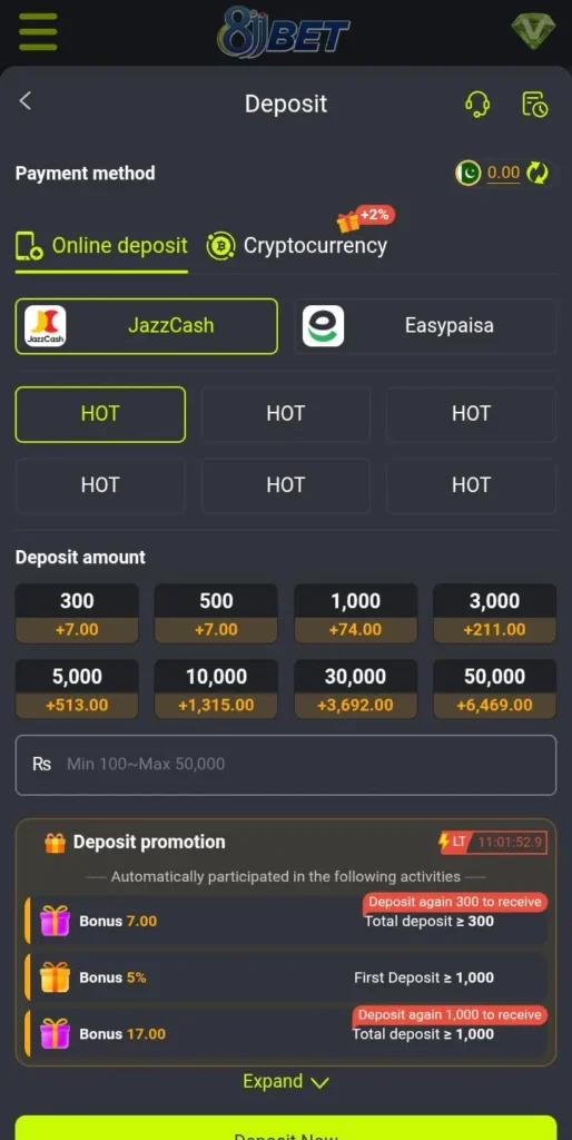 8JJ Bet for android supports EasyPaisa and JazzCash. This feature alone attracts many Pakistani users. Deposits and withdrawals feel more practical when you don’t need international payment tools.