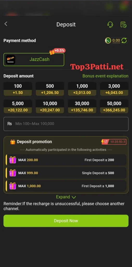 - EasyPaisa support allows quick deposits with simple steps.